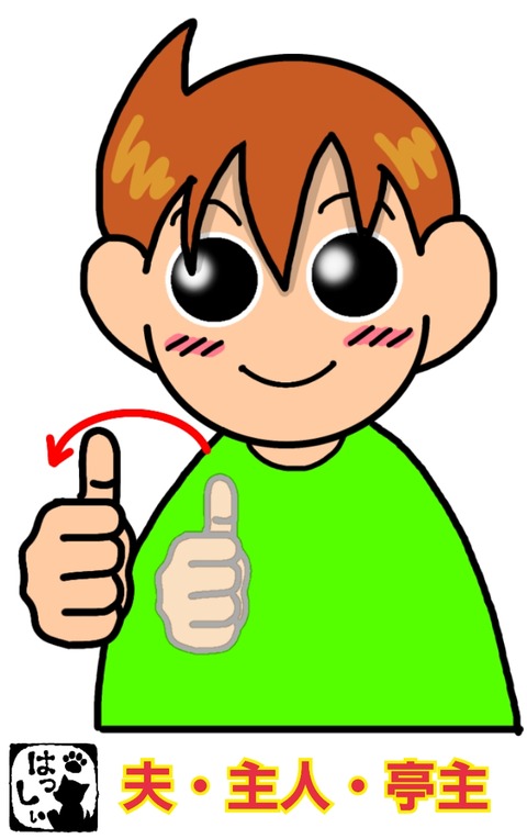 手話単語:371 【夫】【亭主】【主人】 2016年07月14日 こんにちはヾ(´ω`=´ω`)ノ【夫・亭主・主人】胸の前で右手の親指を立てたら、弧を描いて斜め前に出します。 それではまた(○´ω`○)ノ いつも訪問・応援ポチありがとうございます!励みになりますのでこれからもよろしくおねがいします。ε=ε=ε=(●・д・ノ)ノ【。+゚:. ... 続きを読む