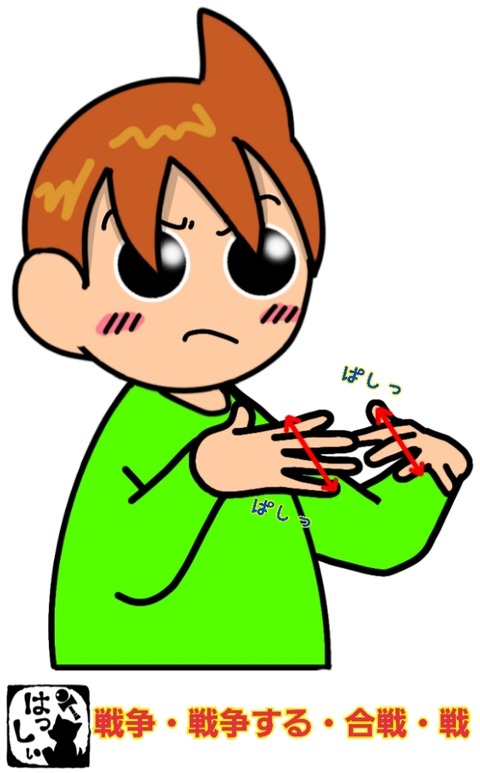 手話単語:387 【戦争】【戦争する】【戦】【合戦】 2016年07月30日 こんにちはヾ(´ω`=´ω`)ノ【戦争・戦争する・戦・合戦】両手を開いて、指先が軽く触れ合うよう交互に前後に動かします。激しい争いの場合は・・・【戦争・戦争する・合戦・戦】両手を開いて左右交互に前後に振って両手の指の指先を数回ぶつけ合います。 それではまた(o^ ... 続きを読む