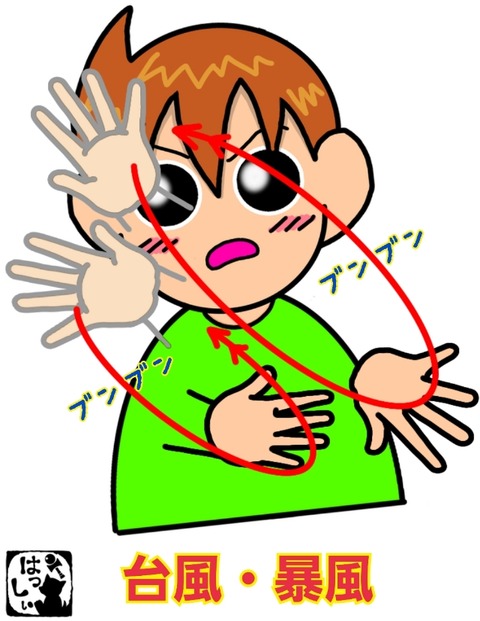 手話単語:373 【台風】【暴風】 2016年07月16日 こんにちは(*・ω・)ノ【台風・暴風】両手を広げて右斜め上から、左斜め下へ手をブンブンと回しながら下します。すごく強い風が吹くイメージです。この表現の後に力強く【雨】をつけて表す方もいます。 それではまた(。・ω・)ノ゙いつも応援ありがとうございます!励みになりま ... 続きを読む