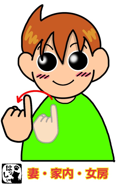 手話単語:372 【妻】【女房】【家内】 2016年07月15日 こんにちはヾ(´ω`=´ω`)ノ【妻・女房・家内】胸の前で右手の小指を立てたら、弧を描いて斜め前に出します。 それではまた(○´ω`○)ノ いつも訪問・応援ポチありがとうございます!励みになりますのでこれからもよろしくおねがいします。ε=ε=ε=(●・д・ノ)ノ【。+゚:. ... 続きを読む