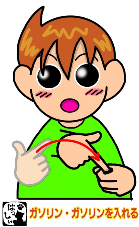 手話単語:379 【ガソリン】【ガソリンを入れる】 2016年07月22日 こんにちは(=゚ω゚)人(゚ω゚=)【ガソリン】右手は親指と人差し指を伸ばして、左手は5指の指先をくっつけて筒の形にして、左手の穴に右手の人差し指を差し込みます。右手が給油ノズル、左手が車の給油口を表しています。それではまた((ヾ( ◍´꒳`◍ )いつも応援ありがとうござ ... 続きを読む