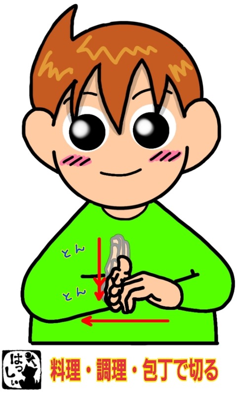 手話単語:451 【料理】【料理する】【調理】【調理する】【包丁で切る】 2016年10月14日 こんにちはヾ(´ω`=´ω`)ノ【料理・料理する・調理・調理する・包丁で切る】左手は何か材料を抑えるような形にして、右手は包丁に見立ててトントンと材料を刻むような仕草をします。 それではまた((ヾ( ◍´꒳`◍ )いつも応援ありがとうございます!良ければ下↓のしゅ ... 続きを読む