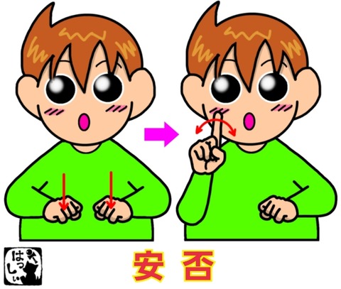 手話単語:454 【安否】 2016年10月18日 こんにちはヾ(´ω`=´ω`)ノ【安否】両手をグーにして胸の前で水平に構えて力強く少し下におろし、【元気】左手は残したままで右手の人差し指を左右に振ります。【どう?】 それではまた((ヾ( ◍´꒳`◍ )いつも応援ありがとうございます!良ければ下↓のしゅうくんをポ ... 続きを読む