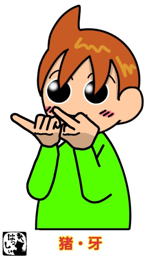 手話単語:494 【猪】【牙】 2016年12月03日 こんにちは(*^・ェ・)ノ【猪・牙】両手の人差し指を前に向けて口の両脇につけて牙を表します。指を軽く曲げて【牙】で表現する方もいます。どうぶつの手話表現も色々あるので標準的な表現を載せておきます。色々聞いてみて地域のろう者に合った表現をしてみてください!それでは ... 続きを読む