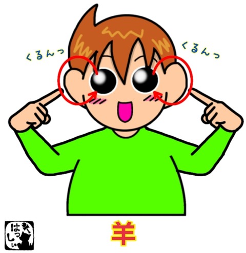 手話単語:492 【羊】 2016年12月01日 こんにちはヾ(´ω`=´ω`)ノ【羊】両手の人差し指を伸ばして頭の横で(こめかみ近く)クルンと円を描きます。ひつじさんの角を表しています。どうぶつの手話表現も色々あるので標準的な表現を載せておきます。色々聞いてみて地域のろう者に合った表現をしてみてください! ... 続きを読む