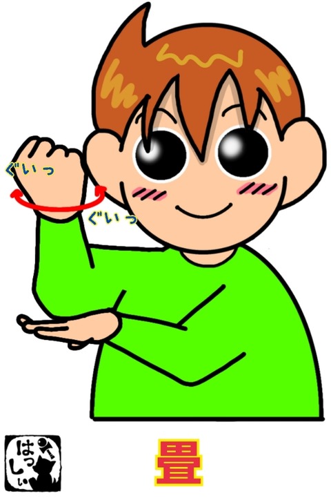 手話単語:496 【畳】 2016年12月07日 こんにちはv( ̄∇ ̄)v【畳】左手の甲の上に右ひじを乗せて、右手は軽くグーにして手首を軸にひねります。畳を縫う仕草からだそうです。他には右肘を上げ下げする表現もあります。それではまた((ヾ( ◍´꒳`◍ )いつも応援ありがとうございます!良ければ下↓のしゅうくんをポ ... 続きを読む