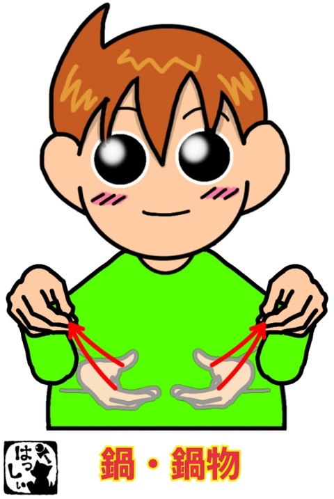 手話単語:495 【鍋】【鍋物】 2016年12月06日 こんにちはヾ(´ω`=´ω`)ノ【鍋・鍋物】両手の親指と他の4指を丸くした形にして指先は向い合せて構えたら、お鍋の形をイメージして親指と4指をシュっと上に上げながらくっつけます。最初に耳たぶを軽くつまんでからこの表現をされるかたもいます。他にもこの表現で【渡 ... 続きを読む