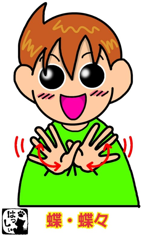 手話単語:978 【蝶】【蝶々】【ちょうちょ】【チョウチョ】 2019年02月22日 こんにちはヾ(´ω`=´ω`)ノ【蝶・蝶々・ちょうちょ・チョウチョ】開いた両手の親指を交差させて、4指をパタパタと同時に上下させます。蝶々がとんでいるイメージで♪それではまた((ヾ( ◍´꒳`◍ )いつも応援ありがとうございます!良ければ下↓のしゅうくんをポチっと ... 続きを読む