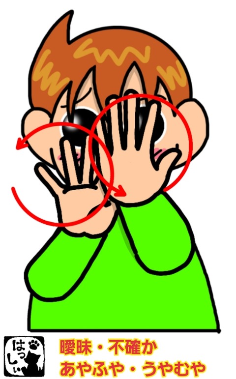 手話単語:997 【曖昧】【不確か】【あやふや】【うやむや】 2019年04月19日 こんにちはヾ(´ω`=´ω`)ノ【曖昧・不確か・あやふや・うやむや】指を広げた両手のひらを目の前で向い合せて。円を交互に描きます。それではまた((ヾ( ◍´꒳`◍ )いつも応援ありがとうございます!良ければ下↓のしゅうくんをポチっと押してね!あいまい・ふたしか・あ ... 続きを読む