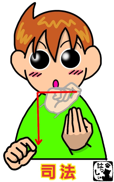 手話単語:991 【司法】 2019年04月14日 こんにちはヾ(´ω`=´ω`)ノ【司法】指文字の【ホ】の形にした左手の上から、つまんだ形にした右手2指を右へ引いてから下におろします。「法」の【ホ】を指文字で示して、「司」の「¬」の形を右手で表現します。それではまた(。・ω・)ノ゙しほう ... 続きを読む