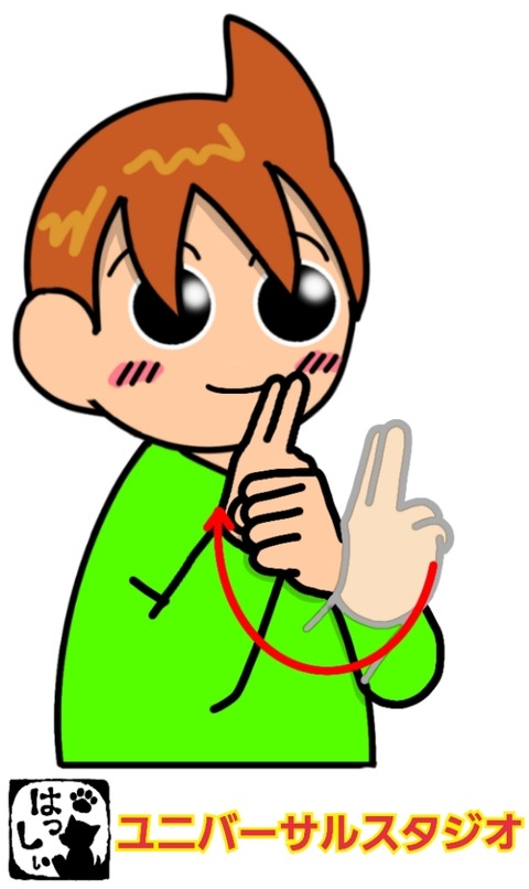 手話単語:1003 【ユニバーサルスタジオ】 2019年04月28日 こんにちは(*・ω・)ノ【ユニバーサルスタジオ】左手をグーにして置き、右手は人差し指と中指をのばして揃えたら、グーにした右手に左手をクルンと一周させます。左手が「地球」で右手は「UNIVERSAL STADIO JAPAN」の文字がクルクル回っている状態を表しています。それではま ... 続きを読む