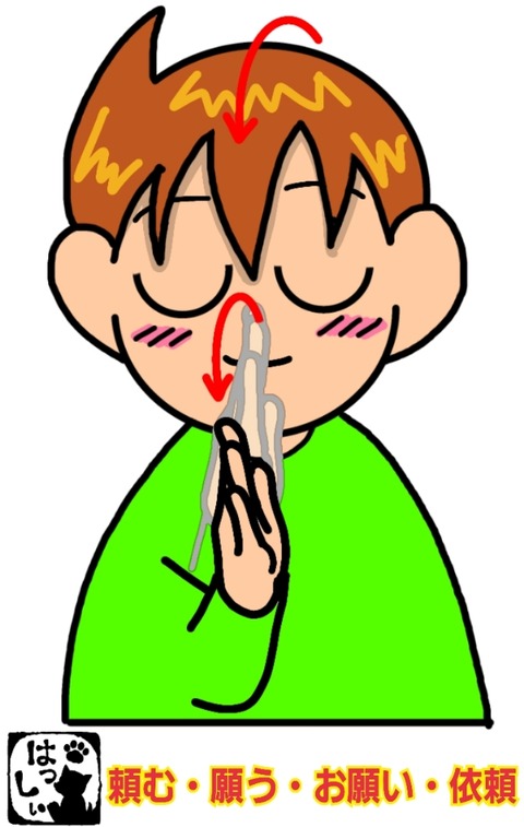 手話単語:993 【頼む】【願う】【お願い】【依頼】 2019年04月16日 こんにちはヾ(´ω`=´ω`)ノ【頼む・願う・お願い・依頼】少し頭を下げて、顔の正面で斜めに構えた右手を少し前に出します。 それではまた(。・ω・)ノ゙いつも応援ポチありがとうございます!励みになりますのでこれからもよろしくおねがいします。ε=ε=ε=(●・д・ノ)ノ【。+゚ ... 続きを読む