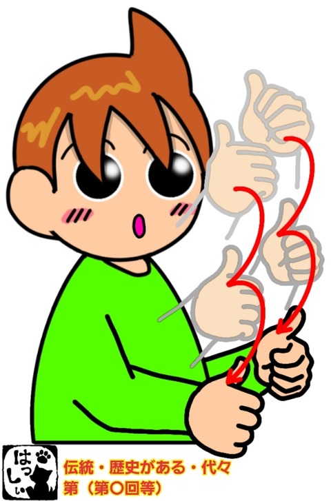 手話単語:1005 【伝統】【歴史がある】【代々】【第(第〇回等)】 2019年04月30日 こんにちは(*・ω・)ノ【伝統・歴史がある・代々・第(第〇回等】両手の親指を立てて向い合せたら、交互に円を描きながら下ろします。代々受け継がれていく様子からの表現です。 それではまた((ヾ( ◍´꒳`◍ )いつも応援ありがとうございます!良ければ下↓のしゅうくんをポチ ... 続きを読む