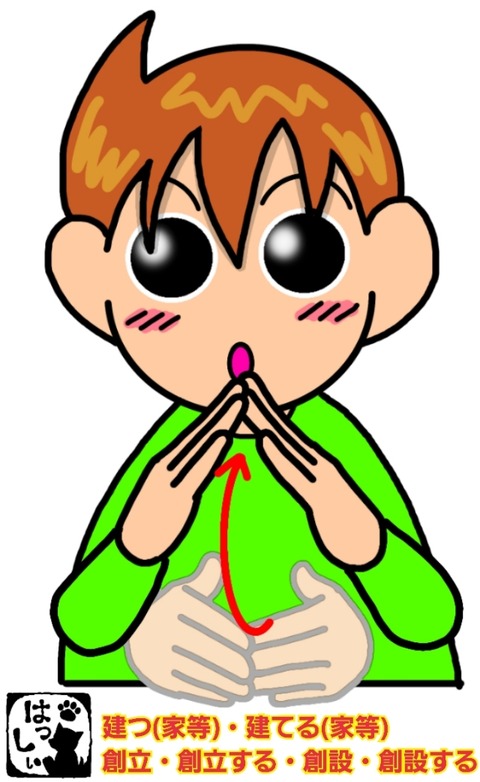 手話単語:988 【建つ〈家等〉】【建てる〈家等〉】【創立】【創立する】【創設】【創設する】 2019年04月11日 こんにちはヾ(´ω`=´ω`)ノ【建つ(家等)・建てる(家等)・創立・創立する・創設・創設する】両手の指先を斜めにつけて指先を前に向け、指先をつけたまま両手を引き起こします。 それではまた((ヾ( ◍´꒳`◍ )いつも応援ありがとうございます!良ければ下↓のしゅうく ... 続きを読む