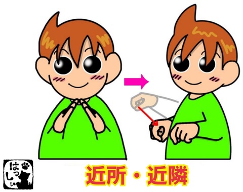 手話単語:1004 【近所】【近隣】 2019年04月29日 こんにちは(*^・ェ・)ノ【近所・近隣】両手の指先をつけて、斜めに構えたら【家】両手の2指はつまんで指先は下に向けた状態で前後に置いて、右手を左手に近付けます。【近い】それではまた((ヾ( ◍´꒳`◍ )いつも応援ありがとうございます!良ければ下↓のしゅうくんをポチっと ... 続きを読む