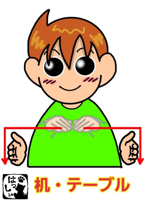 手話単語:1053 【机】【テーブル】 2019年10月15日 こんにちは(*・ω・)ノ【机・テーブル】体の前で親指側をつけた両手を左右へ引き離して、直角に少しだけ下します。それではまた((ヾ( ◍´꒳`◍ )いつも応援ありがとうございます!良ければ下↓のしゅうくんをポチっと押してね!つくえ・てーぶる ... 続きを読む