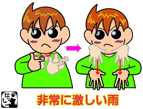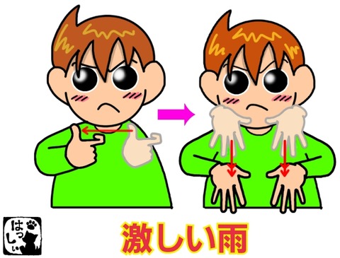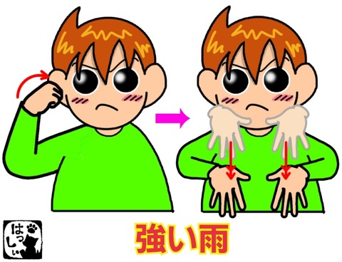 手話単語:1070 【強い雨】 2019年10月30日 こんにちは(*・ω・)ノ災害関係の新しい手話が出たのでご紹介します。【強い雨】腕を曲げて立てたグーにした右手を自分の方へ力強く引いて、【強い】両手の手のひらを開いて指先は下に向け、同時に2回おろします。【雨】表情で強さを表してください。 それではまた((ヾ( ◍ ... 続きを読む