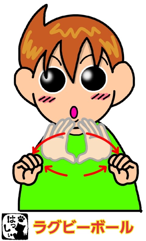 手話単語:1055 【ラグビーボール】【ラグビー】 2019年10月17日 こんにちはヾ(´ω`=´ω`)ノ【ラグビーボール】両手を開いて人差し指と親指の先をつけ、手をすぼめながら左右に引き離します。ラグビーボールの形を表します。【ラグビー】両手を開いて人差し指と親指の先をつけ、手をすぼめながら左右に引き離してボールの形を作ったら、 ... 続きを読む