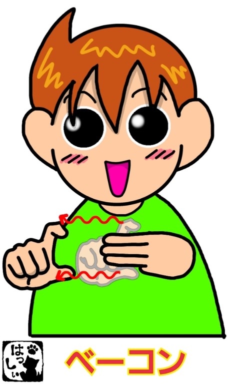 手話単語:1062 【ベーコン】 2019年10月23日 こんにちは(*・ω・)ノ【ベーコン】左手の3指を右手の2指で挟んで、2指を上下させながら右へ動かします。脂身と赤身が3層になっている状況を表しています。それではまた(。・ω・)ノ゙ ... 続きを読む