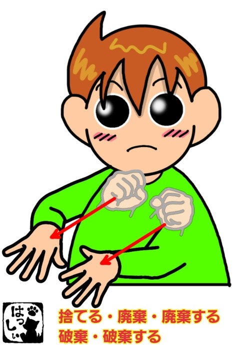 手話単語:1063 【捨てる】【廃棄】【廃棄する】【破棄】【破棄する】 2019年10月24日 こんにちはヾ(´ω`=´ω`)ノ【捨てる・廃棄・廃棄する・破棄・破棄する・放棄】握った両手を開きながら下ろします。ゴミを捨てるイメージで。それではまた((ヾ( ◍´꒳`◍ )いつも応援ありがとうございます!良ければ下↓のしゅうくんをポチっと押してね!すてる・はいき ... 続きを読む