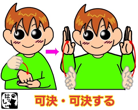 手話単語:1066 【可決】【可決する】 2019年10月28日 こんにちはヾ(´ω`=´ω`)ノ【可決・可決する】開いた左の手のひらに、グーにした右手の背側を叩きつけ、【決定】手のひらを向い合せて置いた両手を同時にスッと素早く引き上げます。それではまた(。・ω・)ノ゙ ... 続きを読む