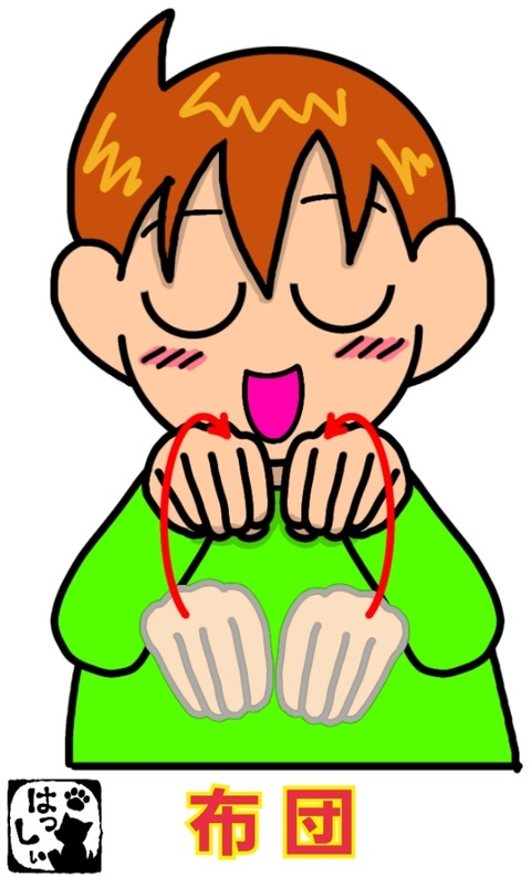 手話単語:1077 【布団】【布団をかける】【布団に入る】 2019年11月08日 こんにちはヾ(´ω`=´ω`)ノ【布団・布団をかける・布団に入る】両手の親指と4指を伸ばして並べて置いたら、そのまま手前に引きます。フワッと布団を自分にかけるイメージです。それではまた((ヾ( ◍´꒳`◍ )いつも応援ありがとうございます!良ければ下↓のしゅうくん ... 続きを読む