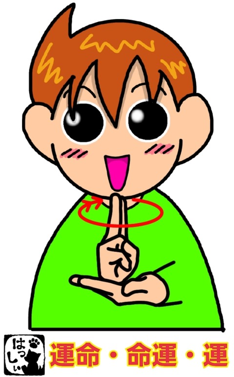 手話単語:1092 【運命】【命運】【運】 2019年11月28日 こんにちはヾ(´ω`=´ω`)ノ【運命・命運・運】左の手のひらに人差し指と中指の2指を伸ばした右手をのせて、クルンクルンと回します。【偶然】と指文字の【ウ】の合体した表現です。それではまた(。・ω・)ノ゙いつも応援ありがとうございます!励みになりますのでこれからも ... 続きを読む