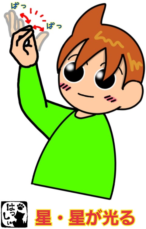 手話単語:1078 【星】【星が光る】 2019年11月09日 こんにちは(*・ω・)ノ【星・星が光る】右手の5指の指先をつけて頭よりも高くあげ、指をパッパッと開いたり閉じたり繰り返します。ほかにもパッパッパッと手を左右に移動させたり、両手で同時に表して満天の星を表す方法などたくさんあります!それではまた((ヾ( ◍´꒳`◍ ) ... 続きを読む