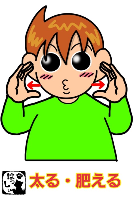 手話単語:1075 【太る】【肥える】 2019年11月06日 こんにちは(*・ω・)ノ2パターンご紹介します(⌒∇⌒)【太る・肥える】両手をそれぞれの頬の横に置いたら、ぷ~っと頬を膨らませると同時に手も左右に引き離します。もいっちょ!【太る・肥える】両手をお腹のところに持っていき、体が膨らんだように両手を左右に引き離します ... 続きを読む