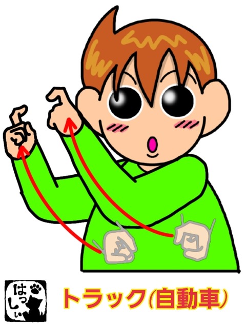 手話単語:1088 【トラック】 2019年11月21日 こんにちは(*・ω・)ノ【トラック】両手の人差し指を指文字の【ヌ】の形にして、お腹のあたりから右肩の上へ同時に引き上げます。荷台に荷物を載せる動作からきているそうです。 それではまた((ヾ( ◍´꒳`◍ )いつも応援ありがとうございます!良ければ下↓のしゅうくんをポチ ... 続きを読む