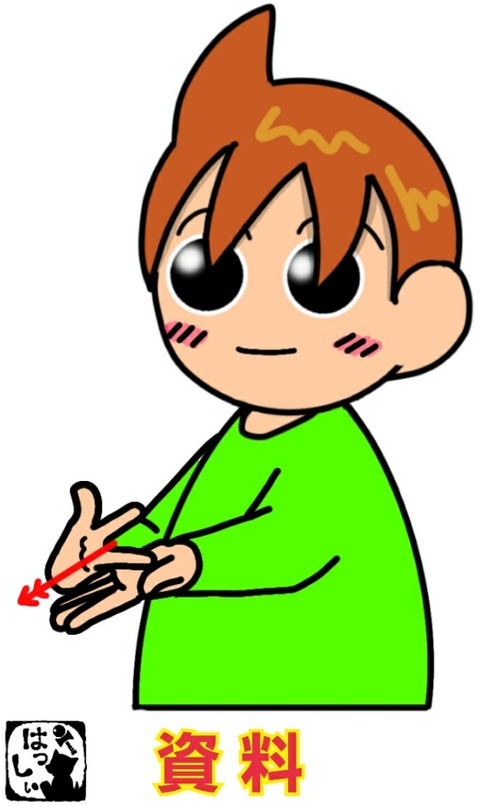 手話単語:1195 【資料】 2021年06月25日 こんにちは(*・ω・)ノ【資料】右手は指文字の【シ】の形にして、開いた左手に置いたら、右手だけをシュッシュッと2回前に出します。指文字の【シ】で資料をめくる表現です。それではまた((ヾ( ◍´꒳`◍ )いつも応援ありがとうございます!良ければ下↓のしゅうくんをポチっ ... 続きを読む