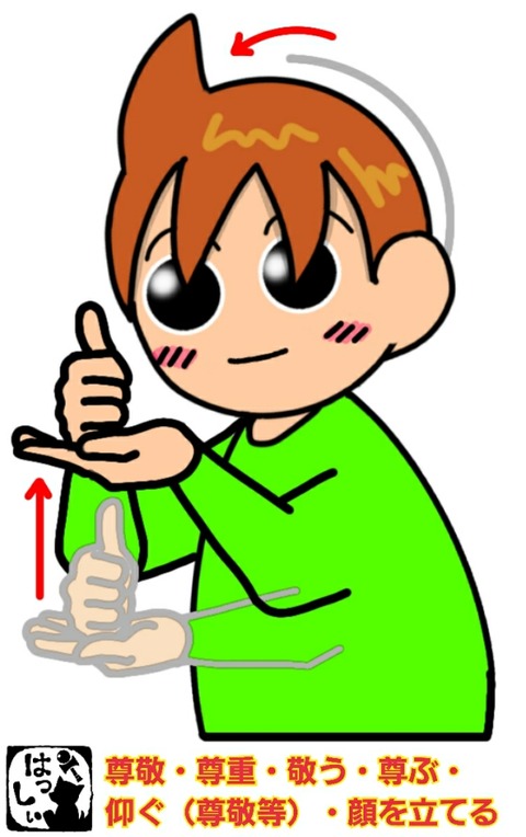 手話単語:1200 【尊敬】【尊敬する】【尊重】【尊重する】【敬う】【尊ぶる】【仰ぐ(尊敬等)】【顔を立てる】 2021年06月30日 こんにちはヾ(´ω`=´ω`)ノ【尊敬・尊敬する・尊重・尊重する・敬う・尊ぶ・仰ぐ〈尊敬等〉・顔を立てる】左手の手のひらに親指を立てた右手をのせて、頭を少し下げて手は上に上げます。それではまた((ヾ( ◍´꒳`◍ )いつも応援ありがとうございます!良ければ下↓のし ... 続きを読む