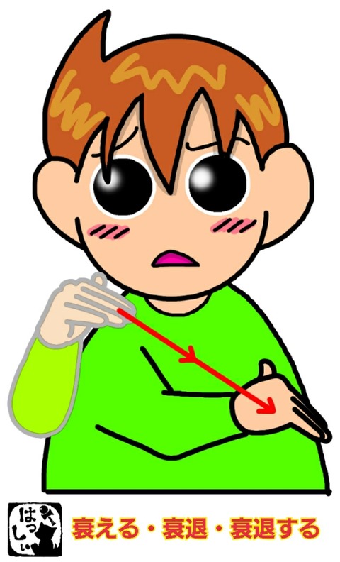 手話単語:1190 【衰える】【衰退】【衰退する】 2021年06月19日 こんにちは(*・ω・)ノ【衰える・衰退・衰退する】右手を指文字の【コ】の形にして、左斜め下へ下ろしていきます。それではまた((ヾ( ◍´꒳`◍ )いつも応援ありがとうございます!良ければ下↓のしゅうくんをポチっと押してね!おとろえる・すいたい・すいたいする ... 続きを読む