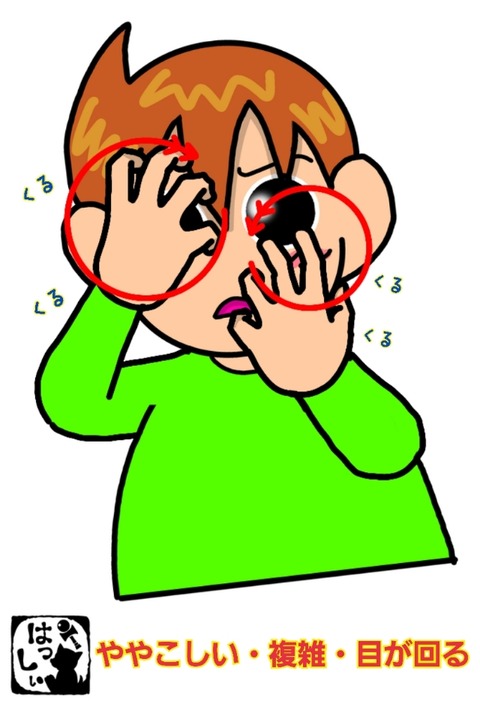 手話単語:1271 【ややこしい】【複雑】【目が回る】 2022年02月17日 こんにちは(*・ω・)ノ【ややこしい・複雑・目が回る】5指の指先を折り曲げて、両手の指先を両目に向けたら交互にクルクル回します。それではまた((ヾ( ◍´꒳`◍ )いつも応援ありがとうございます!良ければ下↓のしゅうくんをポチっと押してね!ふくざつ・めがまわる ... 続きを読む