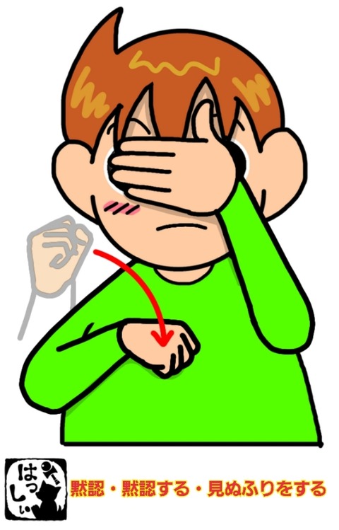 手話単語:1269 【黙認】【黙認する】【見ぬふりをする】 2022年02月15日 こんにちは(*・ω・)ノ【黙認・黙認する・見ぬふりをする】パーにした左手で目を覆って、右手はグーにして立てたら腕をさげながら、手首をカクンと折り曲げます。グーにした右手は「うん。」とうなずいたイメージ。それではまた((ヾ( ◍´꒳`◍ )いつも応援ありがとうございま ... 続きを読む