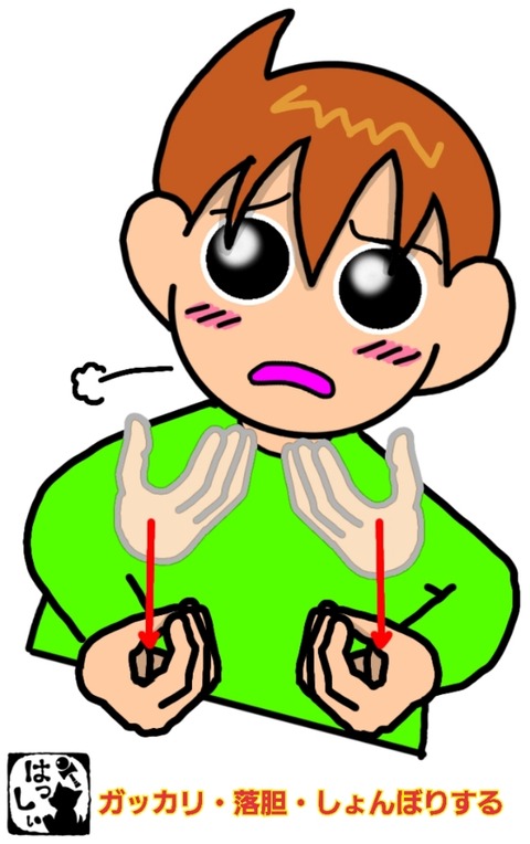 手話単語:1275 【がっかり】【落胆】【落胆する】【しょんぼりする】 2022年03月28日 こんにちは(*・ω・)ノ【がっかり・落胆・落胆する・しょんぼりする】少し開いて指先を上に向けた両手を胸に沿ってスッと下ろしながら閉じて、シュンと肩を落とします。それではまた((ヾ( ◍´꒳`◍ )いつも応援ありがとうございます!良ければ下↓のしゅうくんをポチっと押し ... 続きを読む