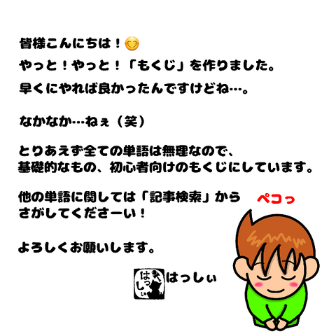 もくじをやっと・・・w(追記あり) 2022年06月20日 もくじメニューバーも少し編集しましたのでそちらもご活用ください!また、他の単語のもくじ(どうぶつなど)については作成中なのでしばしお待ちください・・・。 ... 続きを読む