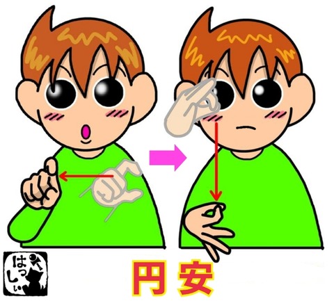 手話単語:1311 【円安】 2022年06月16日 こんにちは(*・ω・)ノ【円安】右手の人差し指と親指を折り曲げて、指先は相手側に向けたら左から右に移動させ、【円】右手の親指と人差し指の先をつけて輪を(お金)作り、下にさげます。【安い】 それではまた((ヾ( ◍´꒳`◍ )いつも応援ありがとうございます!良ければ下 ... 続きを読む