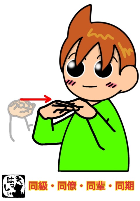 手話単語:1325 【同級】【同僚】【同輩】【同期】 2022年07月18日 こんにちは(*・ω・)ノ【同級・同僚・同輩・同期】両手を開いて手のひらは下に向けて左手は手前に置き、左手の小指側に右手の親指側を前から引き寄せてつけ合わせます。私は同級生や同期がいるからサークルを楽しめてるところがあります(o^∇^o)ノそれではまた(。・ω・)ノ゙いつも応 ... 続きを読む