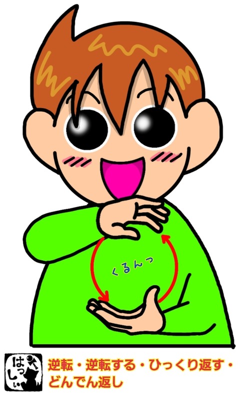 手話単語:1342 【逆転】【逆転する】【ひっくり返す】【どんでん返し】 2022年08月08日 こんにちは(*・ω・)ノ【逆転・逆転する・ひっくり返す・どんでん返し】両手の手のひらを上下に向い合せに構え、半円を描いて上下の手をクルンと入れ替えます。それではまた((ヾ( ◍´꒳`◍ )いつも応援ありがとうございます!良ければ下↓のしゅうくんをポチっと押してね!ぎ ... 続きを読む