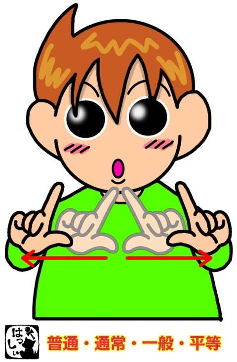 手話単語:1357 【普通】【通常】【一般】【平等】 2022年08月29日 こんにちは(*・ω・)ノ【普通・通常・一般・平等】両手の人差し指と親指2指を開いて前に向け、左右へ引き離します。 それではまた(。・ω・)ノ゙いつも応援ポチありがとうございます!励みになりますのでこれからもよろしくおねがいします。ε=ε=ε=(●・д・ノ)ノ【。+゚:.感謝.:゚+。 ... 続きを読む