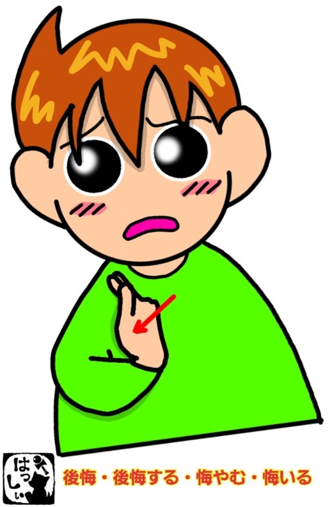 手話単語:1367 【後悔】【後悔する】【悔やむ】【悔いる】 2022年09月09日 こんにちは(*・ω・)ノ2パターンご紹介します!【後悔・後悔する・悔やむ・悔いる】右手の小指側で右胸の上部をたたきます。もういっちょ!【後悔・後悔する・悔いる・悔やむ】右手の小指側で首を叩きます。首を自分でチョップする感じ。それではまた((ヾ( ◍´꒳`◍ )いつも ... 続きを読む