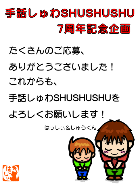 ★祝7周年記念!&国際手話指文字表&指文字表カラー&プレゼント企画(追記あり) 2022年09月15日 みなさん!こんにちは(*・ω・)ノちょっと早いけど、9月19日で手話しゅわSHUSHUSHUは7周年を迎えま~すぅぅ ゚∀゚)ホホホ7年です。この飽き性の私が7年このブログを続けてます(・∀・)以前にもお話しましたが、ここを始めたきっかけは、手話奉仕員仲間が、「はっしぃ、イラ ... 続きを読む