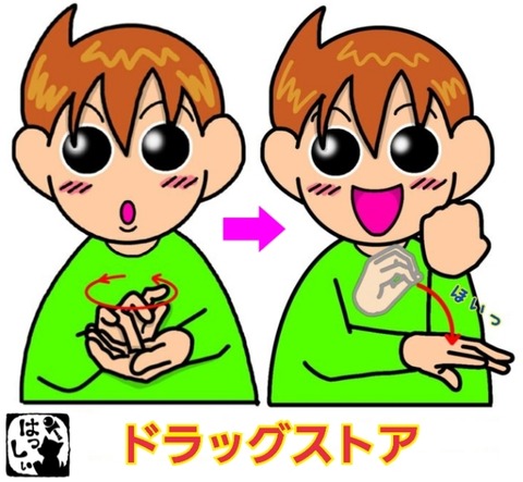 手話単語:1710 【ドラッグストア】 2023年06月26日 こんにちは(*・ω・)ノ【ドラッグストア】右手の薬指を曲げて指先を、上に向けた左の手のひらの上で小さな円を描くようにこすり、【薬】つまんで前から引き寄せた右手を、左腕の下へパッと指を開きながら下ろします。【スーパーマーケット】それではまた((ヾ( ◍´꒳`◍ )いつ ... 続きを読む