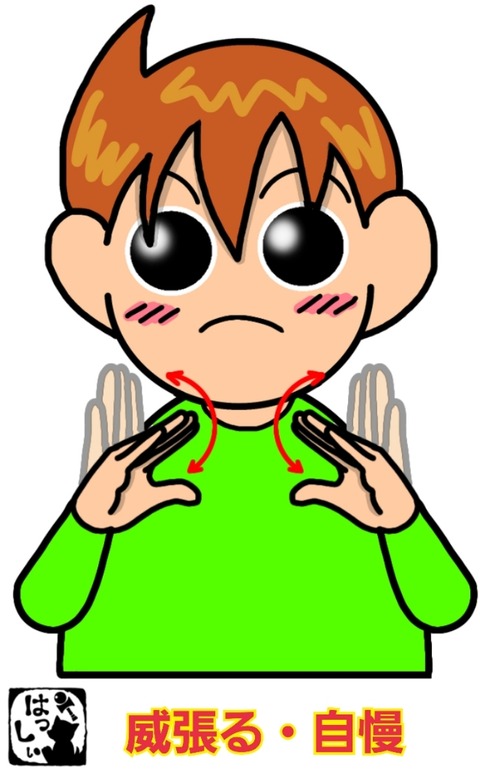 手話単語:1703 【威張る】【自慢】【自慢する】 2023年06月19日 こんにちは(*・ω・)ノ【威張る・自慢・自慢する】両手の親指の先を両胸につけて、両手の4指を上下に軽く開いたり閉じたりします。胸をはって威張りん坊のお顔で。 それではまた((ヾ( ◍´꒳`◍ )いつも応援ありがとうございます!良ければ下↓のしゅうくんをポチっと押して ... 続きを読む