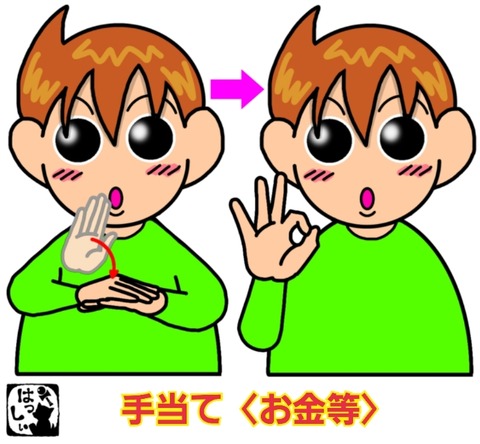 手話単語:1705 【手当て〈お金等〉】 2023年06月21日 こんにちは(*・ω・)ノ【手当て〈お金等〉】右手で左手の甲を叩いて、親指と人差し指の2指を輪っかにして【お金】を示します。それではまた((ヾ( ◍´꒳`◍ )いつも応援ありがとうございます!良ければ下↓のしゅうくんをポチっと押してね!てあて ... 続きを読む