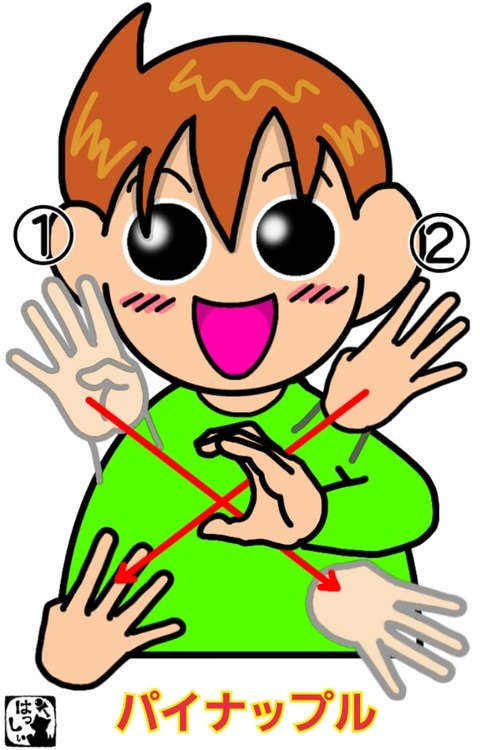 手話単語:1709 【パイナップル】 2023年06月25日 こんにちは(*・ω・)ノ【パイナップル】丸めた左手の5指へ、親指だけ折り曲げて指を広げた右手で【✕】を描きます。パイナップルの表面の角形模様を表現しています。それではまた((ヾ( ◍´꒳`◍ )いつも応援ありがとうございます!良ければ下↓のしゅうくんをポチっと押して ... 続きを読む