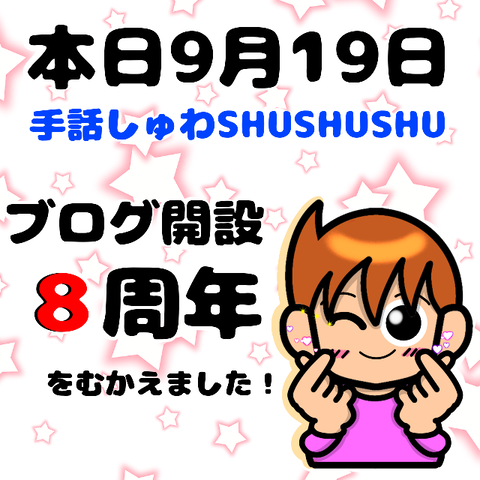 ★祝☆手話しゅわSHUSHUSHU8周年! 2023年09月19日 みなさん、こんにちは(*・ω・)ノ飽き性の私が手話と、このブログだけは続けている・・・。すごいですwww本当に熱しやすく冷めやすい性格なので・・・。手話をはじめて3年目くらいに自分の備忘録的な感覚ではじめたブログも、いまではたくさんの方に利用していただいていま ... 続きを読む