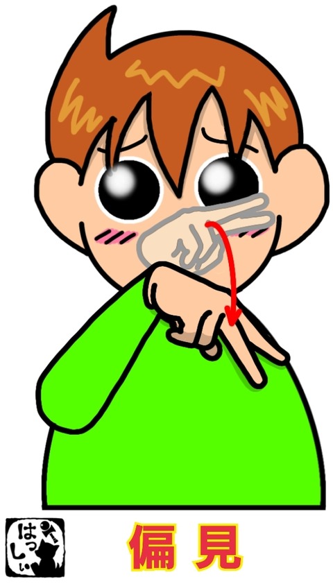手話単語:2071 【偏見】 2024年09月06日 こんにちは(*・ω・)ノ2パターンご紹介します。【偏見】右手の人差し指と中指を伸ばして一瞬誰かを見ているようにして、すぐに手首からカクンと指先を下に向けます。もいっちょ!【偏見】両手の指先を前に向けて手のひらを向いあわせたら左側へカーブを描いて、頭をかしげて右 ... 続きを読む