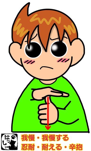 手話単語:194 【我慢】【我慢する】【耐える】【辛抱】【忍耐】 2016年01月16日 こんにちはヾ(´ω`=´ω`)ノ【我慢・我慢する・耐える・辛抱・忍耐】左手の親指を立てたら、その指先を右手のひらに当てて、そのまま上から押し下げます。それではまた(○´ω`○)ノ いつも訪問・応援ポチありがとうございます!励みになりますのでこれからもよろしくおねがいします。ε=ε=ε=(●・д・ノ)ノ【。+゚:.感謝.:゚+。】 「手話単語」カテゴリの最新記事 < 前の記事次の記事 > コメント コメントフォーム 名前 コメント 記事の評価 リセット リセット 顔 星 情報を記憶 コメントを投稿する
